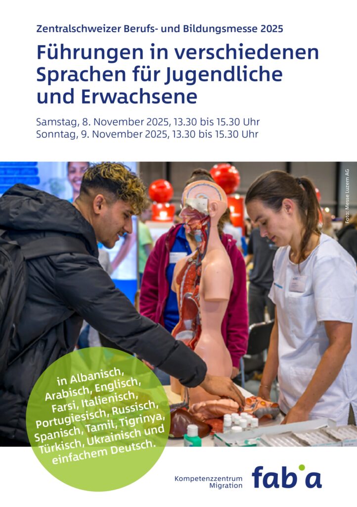 Sonntag, 9. November 2025, 13.30 bis 15.30 UhrMöchten Sie sich über die vielfältigen Angebote der beruflichen Aus- und Weiterbildung in der Schweiz informieren? Sind Sie Eltern von Jugendlichen im Berufswahlalter und wollen Ihre Tochter oder Ihren Sohn bei der Berufswahl unterstützen oder selbst an einer beruflichen Aus- oder Weiterbildung interessiert? Dann besuchen Sie die Zebi-Führung in Ihrer Herkunftssprache oder in einfachem Deutsch!